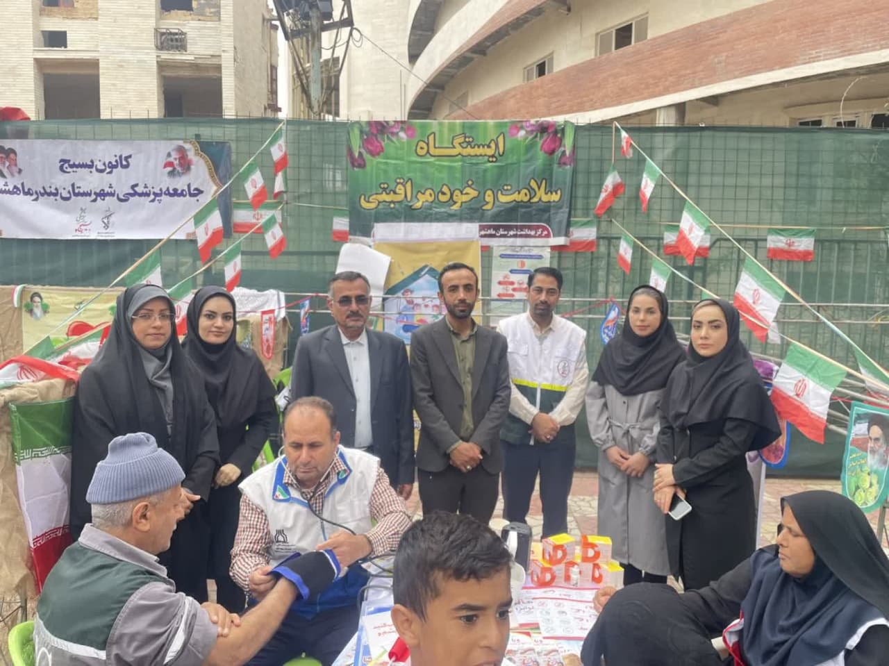 برپایی ایستگاه سلامت شهرستان بندرماهشهر در مسیر راهپیمایی یوم الله ۲۲ بهمن ماه ۱۴۰۲ توسط کارشناسان واحد‌های ستاد مرکز بهداشت و ارائه خدمات بهداشتی از جمله اندازه گیری قندخون، فشار خون، توزیع مکمل ها و بسته های آموزشی
