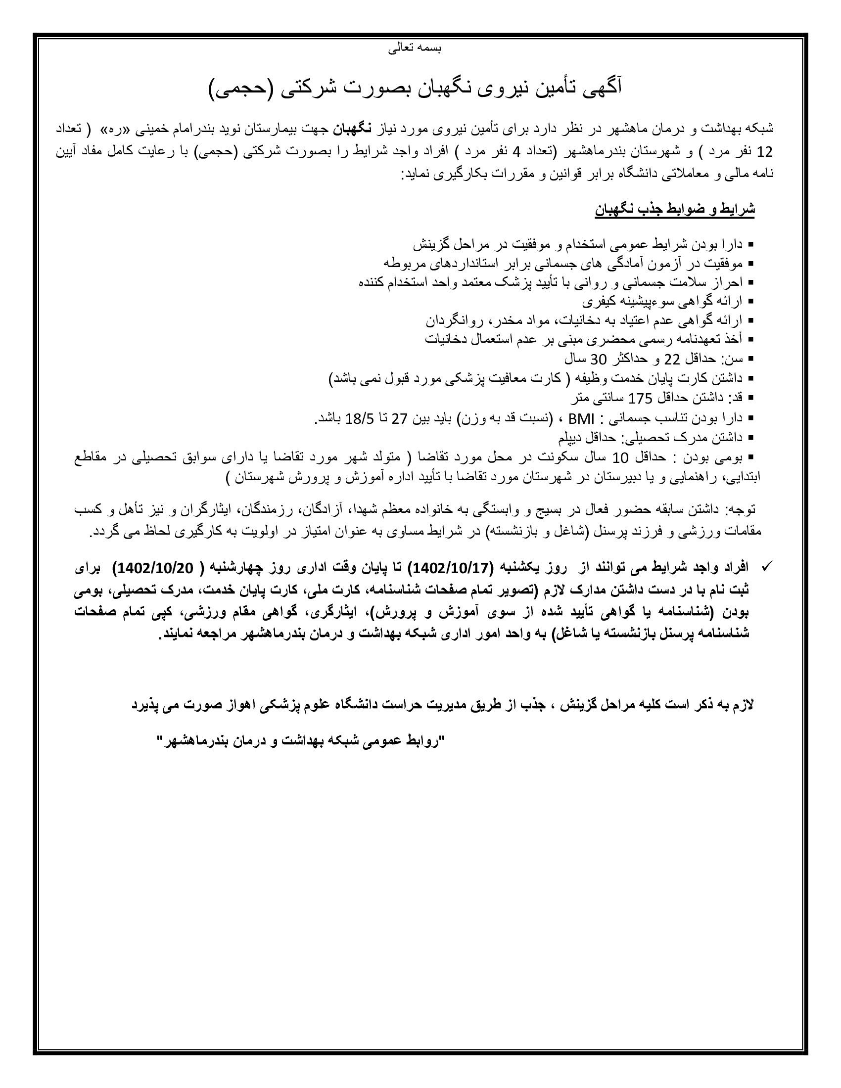 لازم به ذکر است کلیه مراحل گزینش ، جذب از طریق مدیریت حراست دانشگاه علوم پزشکی اهواز  صورت می پذیرد .